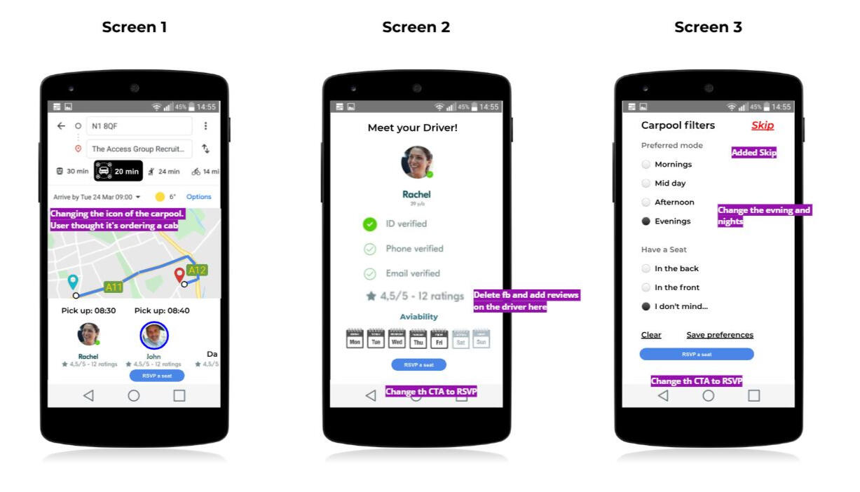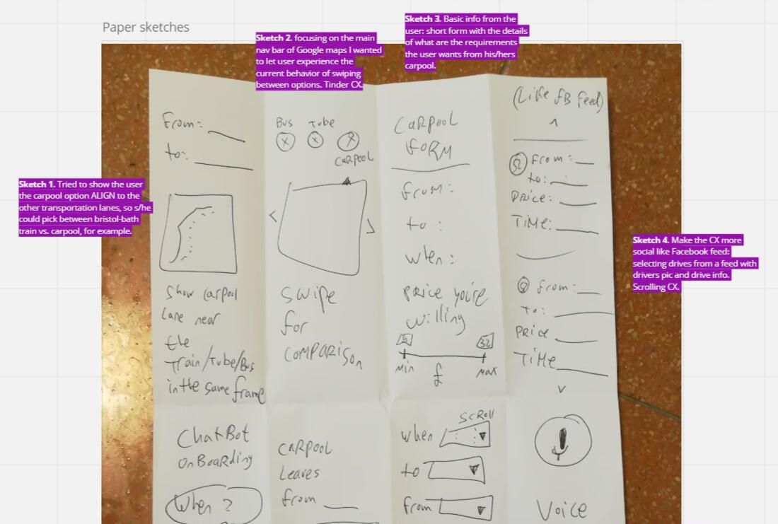 Understanding users’ needs and behavior is crucial for a great experience. Therefore I deep dive into research for the target audience and competing market first to develop the project’s strategy. 1st step: craft a survey I posted on carpool forums [Fb groups] then interview users [mostly Israeli soldiers trying to get to their base.] and do some competitive audits on carpool apps like BlaBlaCar, Lyft, Uber, etc.