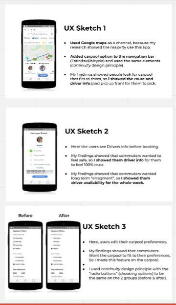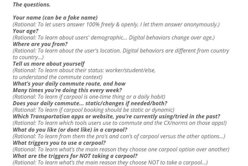 After collecting all the data from the users, I found patterns in the answers: Ex. carpooling isn't an impulse event [Like Uber], It's a daily task [commute to/from work/Uni].